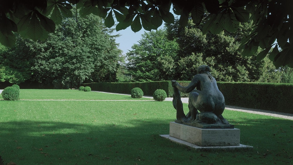 The spacious gardens were commissioned from the Mertens brothers of Zurich by the architect of the villa, Maurice Turrettini. They are among the most beautiful and best-preserved historic gardens in Switzerland. The formal section adjoining the villa is rectangular and symmetrical, forming a transition from the surrounding landscape to the relatively severe architecture. Its two interconnected levels create variety and respond to the character of the hillside site. The second section, beyond the hedge at the edge of the formal garden, increases this diversity, extending over the hillside in a much freer and more natural arrangement. Oskar Reinhart added water features and some fine sculptures to the formal garden. These grant the surroundings a certain grandeur, even though a few works have had to be moved inside for conservation reasons.
